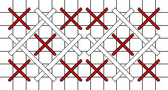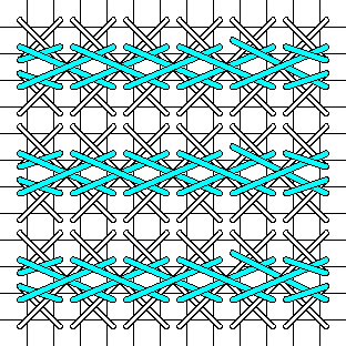 When stitching with 6-strand embroidery cotton, use the number of strands that is comfortable for you. Working on congress cloth, I use 2 strands for diagonal stitches and 3 strands for upright stitches. Depending on your tension and ability to lay threads, you may need to add or subtract strands. If you are not happy with the way your stitching looks, change the number of strands. Make sure you use your laying tool to keep the individual strands flat and untwisted.