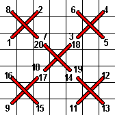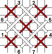 | Step 1 — Cross stitch over 2 threads | Step 2 — Plaited Cross; note that stitch 7–8 weaves under stitch 1–2 so all four legs of the cross are properly plaited |